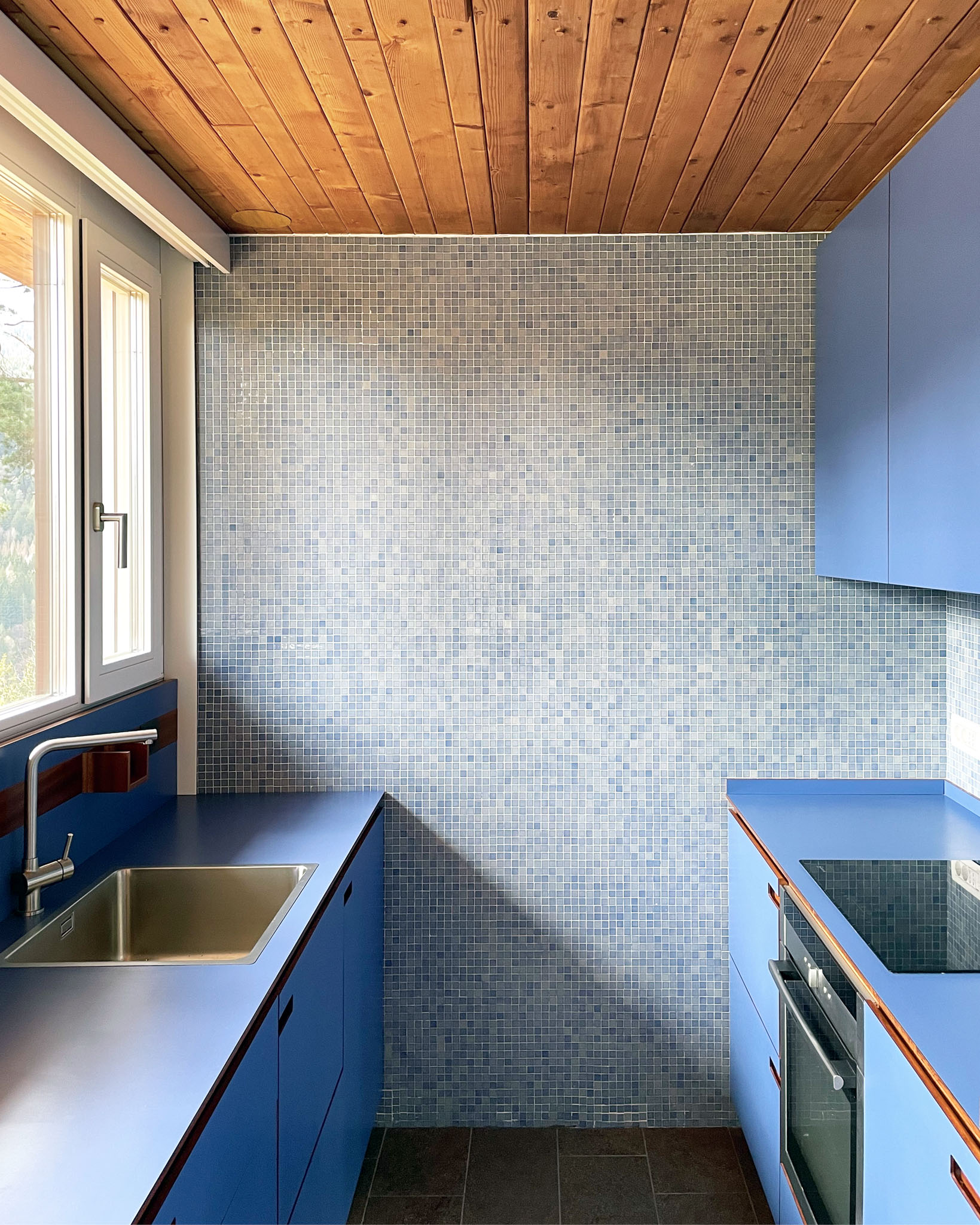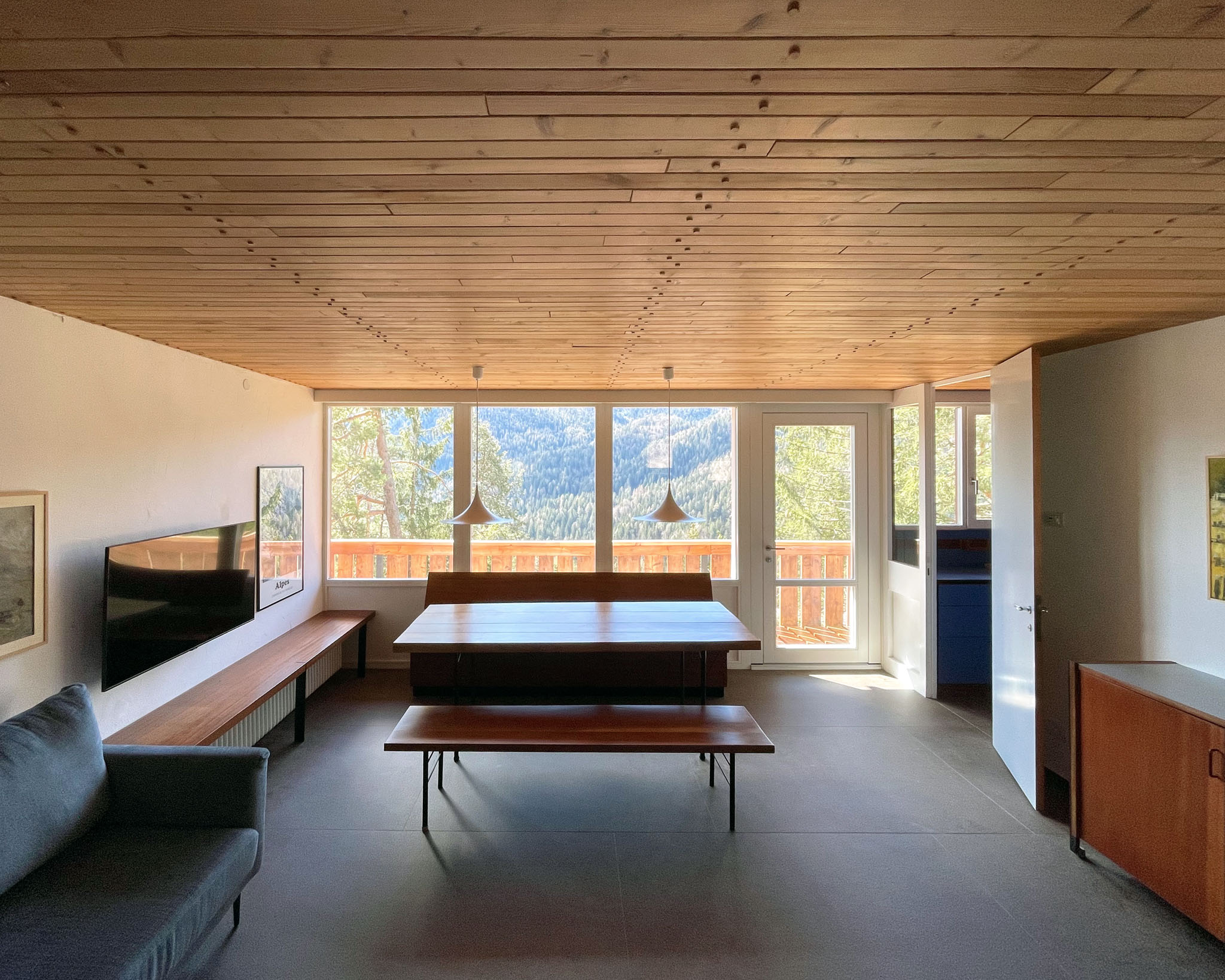 Il progetto di riqualificazione del modulo 230 inizia nel corso del 2019, incontra una sosta forzata durante la pandemia Covid 19 e si conclude durante l’estate del 2020. A Settembre dello stesso anno iniziano i lavori per concludersi circa un anno dopo a seguito di un lento processo di comprensione del progetto, dei materiali, delle metodologie per ogni singolo intervento. Il cantiere, come in ogni lavoro di riqualificazione, diventa il vero momento del confronto, della verifica e del ragionamento sul progetto in quanto proprio in questa fase si affinano le scelte tecniche derivate dalle condizioni dell’esistente. Questa fase ci ha permesso di comprendere meglio la tecnica costruttiva ideata da Gellner, tecnica derivata dall’architettura anonima vernacolare da lui attentamente studiata ed approfondita e messa in atto in questo progetto dove le circostanze storiche e sociali lo portarono ad esprimere una vera architettura di sintesi. La buona riuscita di questo lavoro di riqualificazione nasce da due fattori precisi: l’esperienza sul campo che ha permesso di maturare le giuste scelte tecniche; il fatto che i committenti, prima della riqualificazione, avessero scelto di abitare già la casa e quindi di comprendere meglio quali fossero gli elementi di miglioramento del comfort su cui lavorare per ottenere un miglioramento adeguato al futuro uso del modulo. Dal punto di vista distributivo non ci sono state particolari modifiche se non quella di migliorare l’ambito di accesso alla casa. La montagna infatti impone un rito di “svestizione” al rientro sia per le attività estive che per quelle invernali. L’ambiente ingresso quindi viene studiato in ogni dettaglio per andare ad ospitare, tramite un sistema di ambiti d’arredo tutte quelle attrezzature ed abiti tecnici che rimangono in questo luogo di filtro. Gli interventi maggiormente impegnativi sono stati quelli necessari a migliorare l’efficienza energetica del modulo e quelli riguardanti la messa a norma degli impianti meccanico ed elettrico. Non è stato semplice in quanto il pacchetto del solaio fra piano terra e seminterrato non aveva sufficiente spazio per implementare i sottoservizi. Abbiamo quindi optato di utilizzare lo spazio libero nell’intercapedine sottostante tra casa e terreno per far correre scarichi e condotte del sistema di riscaldamento (opportunamente isolate), mentre per la parte elettrica abbiamo sfruttato, dove possibile, una sottile controparte introdotta ad isolare in maniera più efficace la casa dall’esterno. Alcuni interventi hanno anche previsto il parziale smontaggio e successivo rimontaggio del controsoffitto originario a doghe in legno di cirmolo. La ricerca di tutti i nuovi materiali di rivestimento (pareti e pavimenti) si è sviluppata partendo dai colori presenti in questo modulo e da una ricerca sviluppata in altri ambiti del villaggio in modo che nulla fosse dissonante e comunque “fuori registro”. Le regole cromatiche e costruttive, sia degli immobili che degli arredi, utilizzate da Gellner furono ben precise, quindi la nostra volontà è stata quella di depurare la casa da quanto aggiunto nel tempo ed aggiungere oggetti declinati secondo le regole dell’epoca. Solo pochi elementi innovativi hanno trovato luogo: le prese elettriche, gli accessori dei bagni, alcuni dettagli decorativi di nuovi arredi. Comunque seguendo regole di riferimento ai materiali originari oppure alle loro geometrie decorative o costruttive. Particolare attenzione abbiamo dedicato al tema dei serramenti che sono stati realizzati su misura e con un disegno e con le partizioni identiche alle esistenti. Si tratta di serramenti adeguati alle attuali richieste energetiche ma con sezioni di profilo e con tinte del tutto identiche a quelli originari dell’epoca. I materiali dei prospetti esterni sono stati trattati con l’applicazione di sostanze protettive, dopo un’accurata pulitura: le doghe verticali di rivestimento in legno, i parapetti in legno e metallo; i setti in calcestruzzo, le parti metalliche (maniglie, chioderie, scossaline, travi IPE).