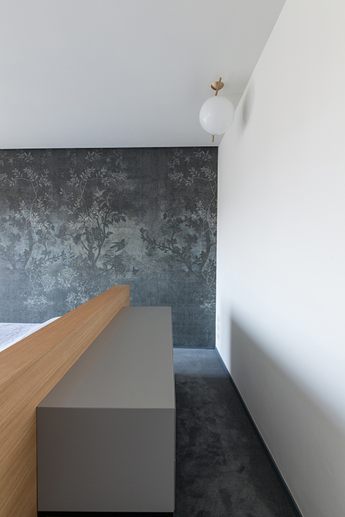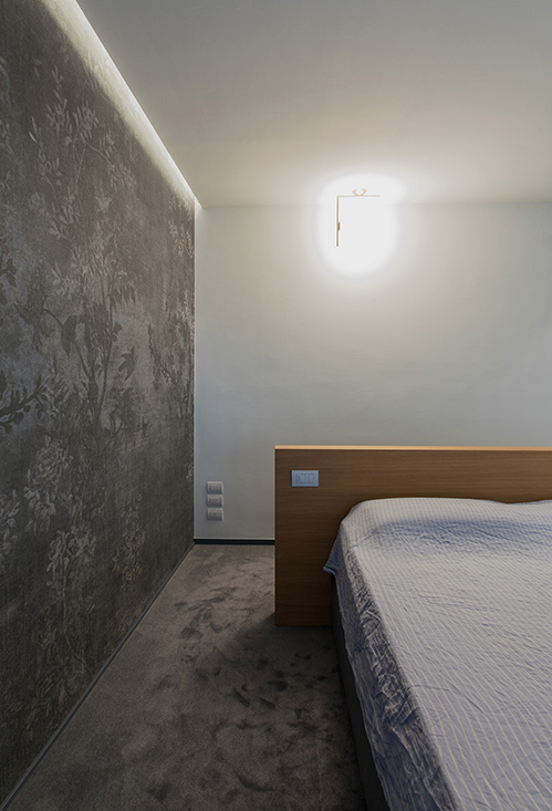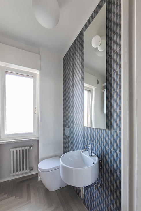 Abbattendo due sole pareti la zona giorno ha ri-guadagnato quella luce che ora pervade lo spazio; Il pavimento in spina di pesce di rovere è quello preesistente ricomposto con alcune tessere nuove laddove necessario. Anche il pavimento turchese del bagno era preesistente ed abbiamo voluto mantenerlo dando luogo ad un dialogo cromatico con il nuovo colore della parete. Ora nuovi spazi reinterpretati e materiali ready-made convivono con scelte contemporanee nella ricerca di un continuo equilibrio fra forme, materiali, proporzioni e luce.