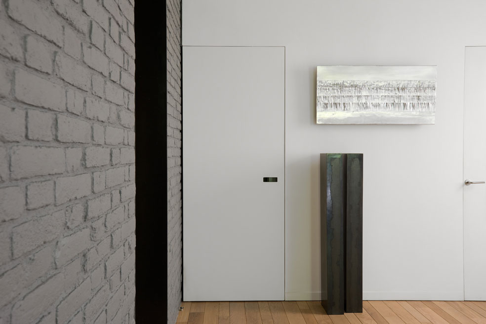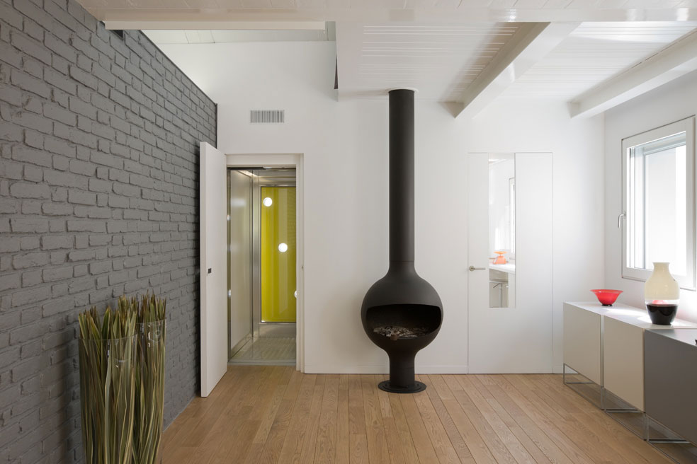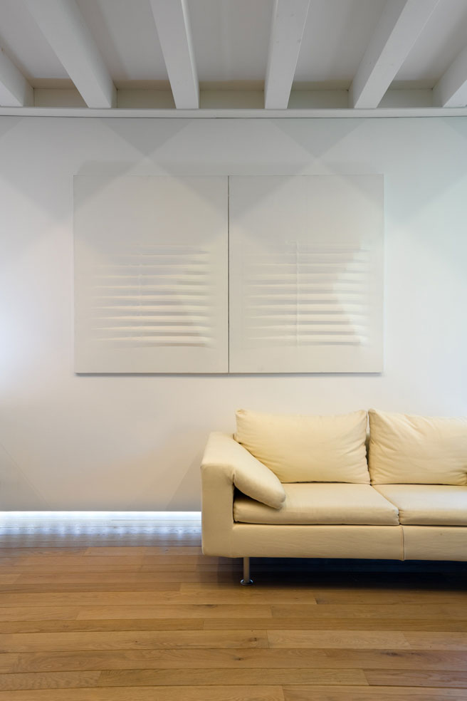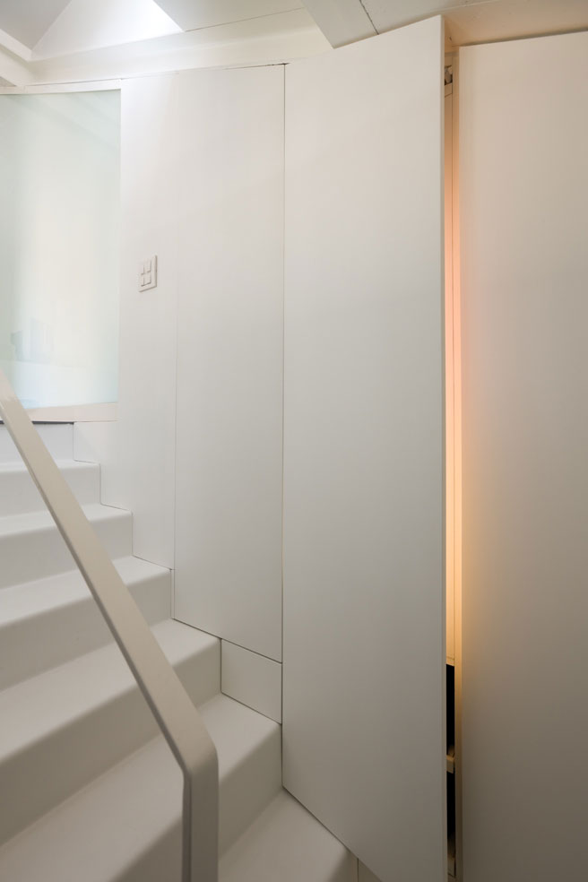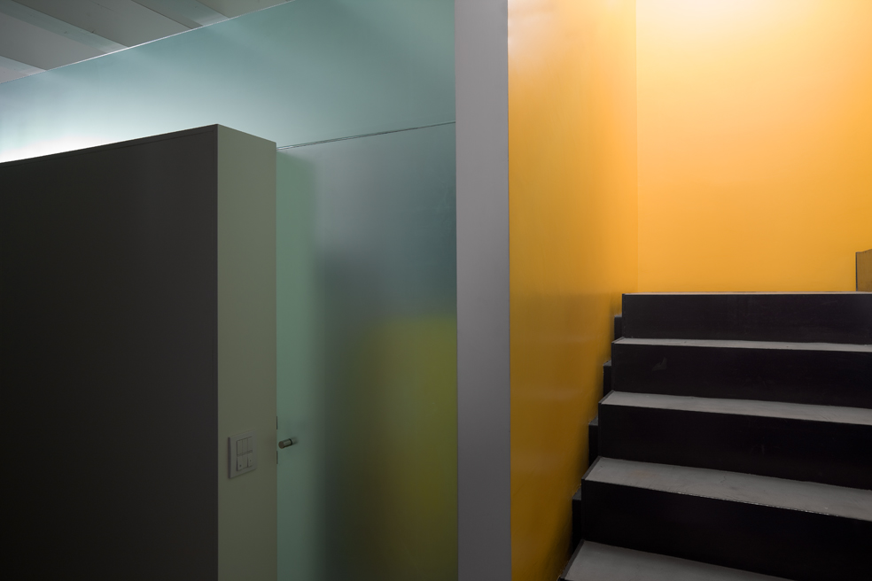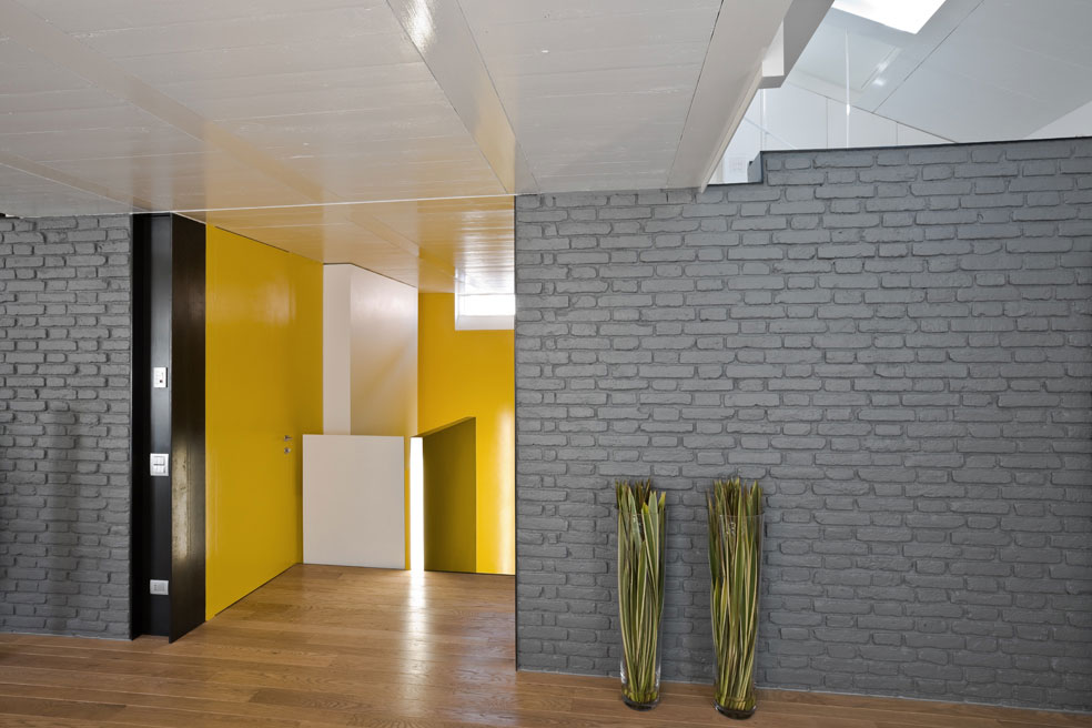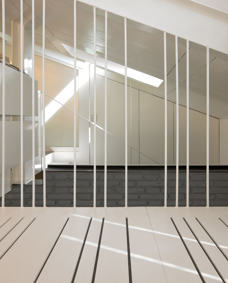 L’intervento si caratterizza per il raumplan, il piano spaziale che si struttura intorno alla scala in ferro con gradini gialli. E’ però al secondo piano che si realizza il momento climax più suggestivo: la doppia altezza lega il soppalco al soggiorno instaurando una continuità visiva con la luce naturale che proviene dal’abbaino e dai tre lucernari. Rispetto all’involucro bianco dell’edificio il “muro-sezione” grigio diviene elemento autonomo grazie all’espediente dell’intercapedine che consente di mantenere intatta la parete preesistente e di collocare intorno il vano con gli impianti tecnici.